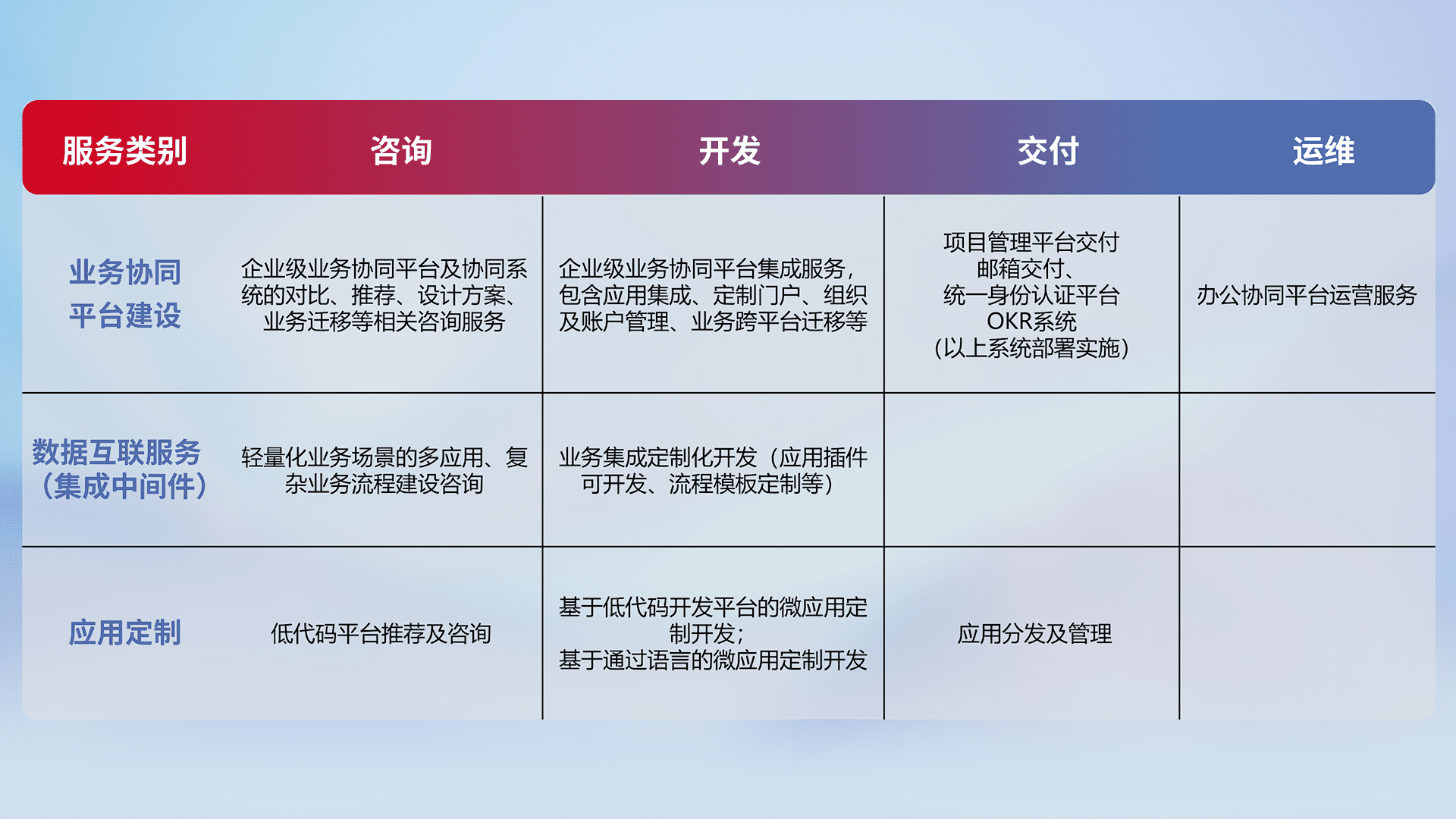 针对钉钉、、、、企微、、IDaas等平台级产品提供产品的规划、、、、方案、、、交付、、定制化开发等服务,,实现如统一协同办公、、智能客户服务、、、混合会议管理、、、智能数据查询、、、等业务场景,,实现数字化转型。。。。